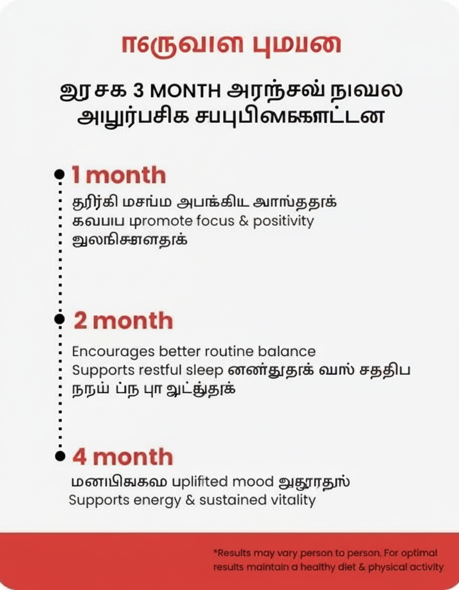 எங்கள் ஃபார்முலாவில், பாதுகாப்பிற்காக அறியப்பட்ட பாரம்பரிய மூலிகைகள் பயன்படுத்தப்படுகின்றன. இருப்பினும், உங்களுக்கு ஏதேனும் மருத்துவ நிலைமைகள் இருந்தால், பயன்படுத்துவதற்கு முன்பு ஒரு சுகாதார நிபுணரை அணுகவும்.